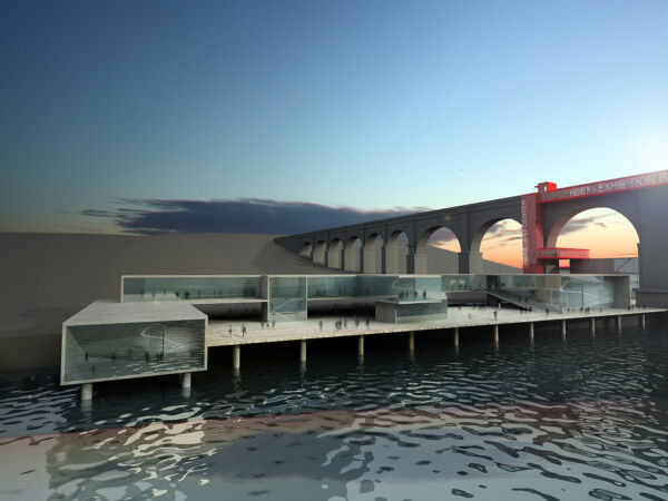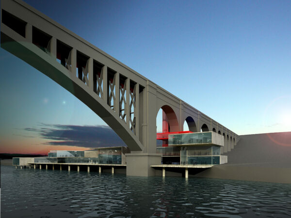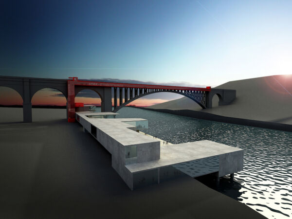 Uno spazio espositivo che si arrampica sul ponte e scende sulle rive stagliandosi fiume Hudson. Conessioni, percorsi esterni ed interni, verticali e orizzontali, si susseguono a gallerie d’arte, spazi espositivi, atelier per artisti e spazi per peroformer. Il rapporto tra interno ed esterno è ridotto al minimo con vetrata molto ampie e spazi e percorsi che si susseguono.