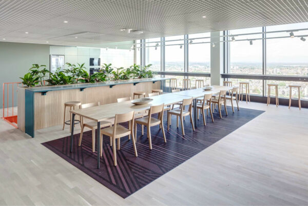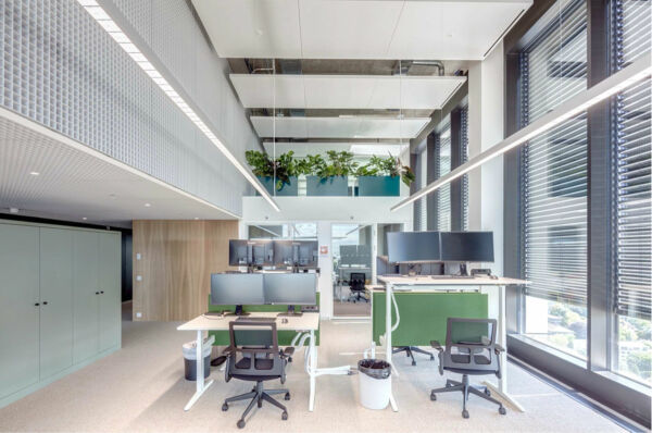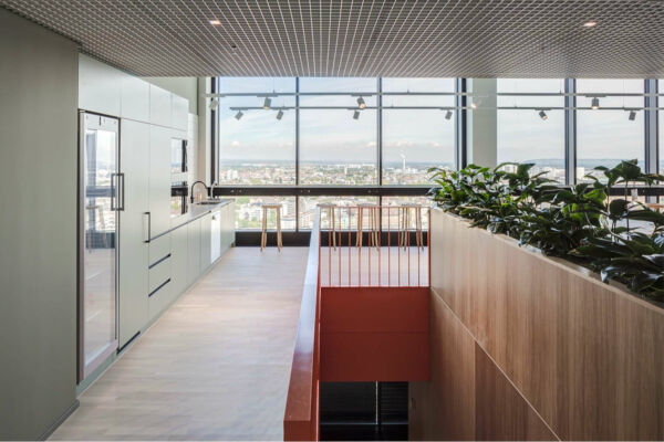 This area is connected to the 22nd floor via a single-flight staircase, which was installed in the course of the tenant fit-out. Primary work and meeting areas are located on this floor. The open spaces are each surrounded by a meeting room, which can also be used as a team lead room, and several telephone rooms.