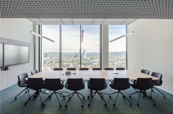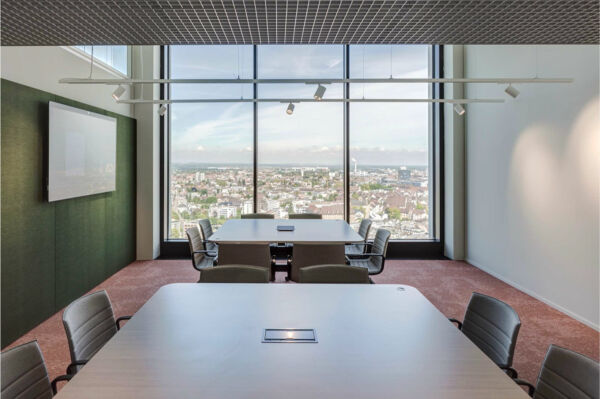 The spaces occupy the floors of the tower and, on the 23rd floor, offer rooms above the façade, which on the one hand provide spectacular views of the city of Basel and the surrounding countryside, and on the other hand allow the space to be staged in different ways. The 23rd floor is home to the client areas including the prestigious reception, various meeting rooms including a boardroom, project room and the heart of the office, the “living room”. The kitchenette there includes a long “dining table” where staff can gather and interact with each other in various ways. An internal “roof terrace” of the walk-in room-in-room box forms a grandstand with a view of Basel Cathedral.