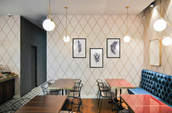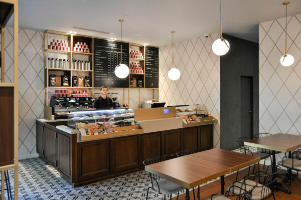 Naringi è una catena di caffetterie in Moldavia. Abbiamo studiato e definito diversi ambienti all’interno del cafè: l’ingresso con ripiani alti e sgabelli per una pausa veloce, la zona bar principale con tavoli, sedie e un grande divano per una pausa più lunga, la zona lounge con poltrone e libreria per un momento di relax.
