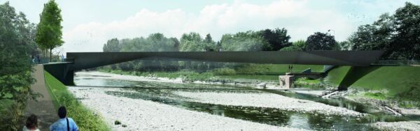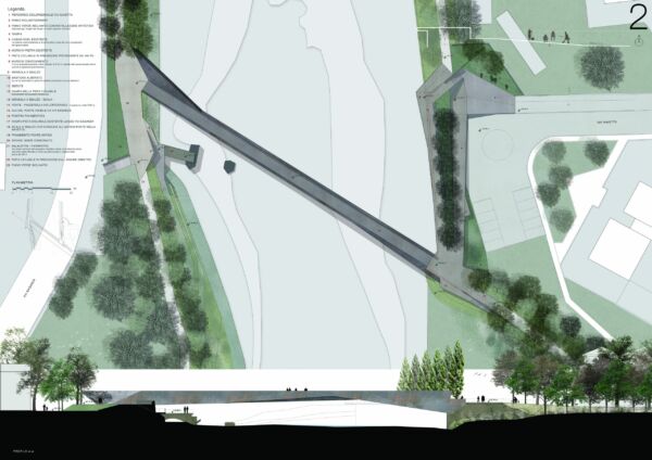 The project therefore seeks to give substance to these differences, which become dynamic a-symmetries, evident both in the profile of the new bridge and in the bank arrangements, where a design with a strong urban character reorganises the intersection between the cycle tracks and the crossing of the watercourse.