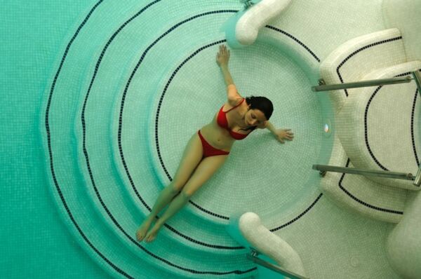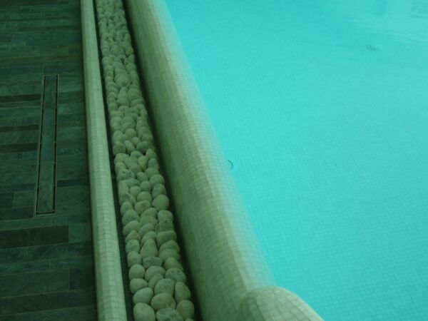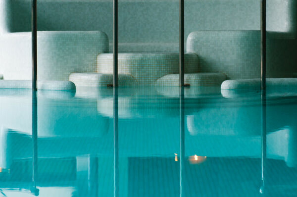 La piscina interna è stata progettata in ogni dettaglio per permettere al rivestimento in mosaico Bisazza color perla di enfatizzare ogni sinuosità. Luci e colori sono studiati per creare un ambiente confortevole e rilassante.